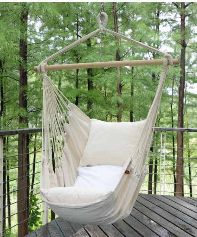 Hammock Chair Hanging Rope Swing with 2 Cushions and Wood Spreader Bar for Indoor or Outdoor Use.